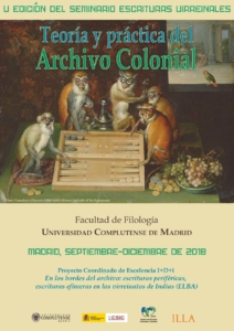 La quinta edición del seminario de Escrituras virreinales, “Teoría y práctica del Archivo colonial”, se desarrollará entre septiembre y diciembre de 2018, comenzando el jueves 27 de septiembre. Todas las sesiones tendrán lugar en la Facultad de Filología de la Universidad Complutense de Madrid.